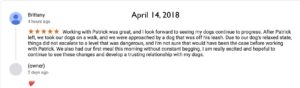 This email is from later the same day of our lesson. “Just returned from our evening walk. My neighbor couldn’t believe the difference in his behavior. She couldn’t believe it was just one lesson. Thank you for your valuable work. I’m feeling very confident that this is just what we needed. Have a good evening.”